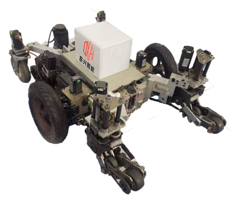 由前腿机构、后腿机构、底盘机构、传动机构、控制系统等部分组成,工作过程中可以携带重达150公斤物体灵活地穿梭于复杂地形环境。其中前腿机构与后腿机构是由轮腿复合式构成的3自由度可执行机构,前后四条腿可以独立进行工作适应复杂地形变化,而后腿携带的多个排轮可以适应较为平缓地段工作,机器人移动过程中根据地形环境可以实现两驱、四驱、六驱、八驱的灵活切换,前后腿携带轮可以灵活的浮动以保证在复杂环境下适应能力。